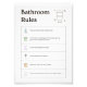 Mantenha as coisas arrumadas e organizadas com este poster de Regras de Banheiros, projetado para lembrar a todos da etiqueta básica do banheiro. Perfeito para casas de banho, este guia claro e conciso encoraja a limpeza e a consideração. Mostre-o no seu banheiro para garantir um ambiente respeitoso e agradável para todos os usuários.