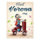 Poster de férias em Verona Itália. Homem de desenho animado num pequeno patinete italiano.
