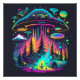 Uma cena de acampamento de OVNI neon no céu noturno.