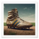 Wall Art & Décor: Uma bota de futebol caseira, vintage, com acabamento de couro vestido e sutil marca Real Madrid contra um fundo minimalista.