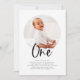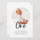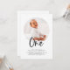 Um primeiro Convite de Aniversário moderno com uma fotografia redonda e a palavra 'Um' com uma letra de estilo caligráfico, perfeito para a festa de primeiro aniversario do seu pequenino!