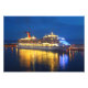 O amanhecer está a caminho, e um navio de cruzeiro, com luzes criando reflexões na superfície da água, já está atracado em Port Canaveral e pronto para girar o dia. Em breve, centenas de passageiros irão para casa, enquanto outros aguardam o início da viagem.