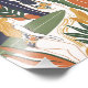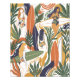 A playful illustration inspired by mid-century style. This wallpaper features stylized surfers in floral swimsuits, longboards in burnt orange, cream, and deep navy, and lush green tropical leaves arranged in bold, curved shapes. The warm, sun-washed color palette conveys a sense of relaxation and artistry.