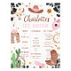 Pink Brown First Rodeo Milestone Birthday Poster Um primeiro sinal de primeiro aniversario rodeado da menina, com algumas botas de vaquinha, chapéu de vaquinha, algumas cordas, cacto, crachá do xerife e padrão de impressão de vaca negra.