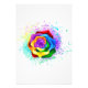 Rosa grande e florescente com pétalas arco-íris sobre fundo branco, pintadas com pedaços de tinta colorida e brilhante. 3d