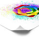 Rosa grande e florescente com pétalas arco-íris sobre fundo branco, pintadas com pedaços de tinta colorida e brilhante. 3d