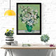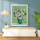 Uma pintura vibrante e viva de Vincent van Gogh, com um buquê exuberante de rosas brancas dispostas em um simples vaso verde. As marcas ousadas e vívidas do artista dão vida às flores contra um fundo verde impressionante.