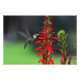 A mulher Ruby Throated Hummingbird parou numa fábrica de Lobelia Vermelha para alguma alimentação.