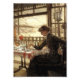 Era vitoriana a pintura de uma jovem mulher na cabine do seu navio com grandes janelas para os navios no porto. Pintura de arte vinda da Inglaterra por James Tissot.