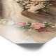 Uma imagem devocional serena de Santa Teresa do Menino Jesus e do Rosto Santo, segurando amorosamente um crucifixo e um buquê de rosas. Rodeada por delicadas flores e posta contra um fundo suave de pergaminho, esta obra de arte reflete a beleza suave associada ao seu "Caminho Pequeno" de confiança, humildade e amor.
