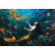 "Seraphina" - Linda Sereia Mística. Sonho Aquático: Neste cenário sereno submarino, uma bela sereia com um rabo de ouro altamente decorado está no leito do mar, seu cabelo fluindo derivando na corrente de um mar azul atordoante. As criaturas do mar circundante, incluindo um polvo humano inquisitivo e um peixe vibrante, trazem vida à cena. Os sutis tons multicoloridos e detalhes intrincados do estilo Pré-Raphaelite fazem disso um quadro cativante e revigorante.