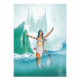 Renderização digital em 3D de uma sereia fofa num oceano sobre um fundo de castelo mágico