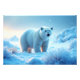 Um design de quebra-cabeça foto-realístico com um urso polar majestoso parado em uma paisagem nevada durante o pôr do sol. O urso encara o espectador diretamente, com um olhar sério e focado. Seu pelo branco liso é iluminado por luz suave e quente, criando uma atmosfera pacífica e serena. Os flocos de neve caem suavemente ao fundo enquanto o sol se põe sobre a paisagem tranquila e congelada. Uma bela mistura de força, calma e beleza natural — perfeita para amantes da vida selvagem e fãs quebra-cabeça.