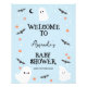 Sinal de Chá de fraldas de Boas-vindas do Halloween Moderno Blue Sinal de Boas-vindas do Dia das Bruxas Meninos com chá de fraldas de boas-vindas apresentando alguns fantasmas, morcegos, estrelas e abóboras em um fundo azul-bebê.