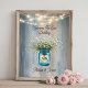 Ponha o tom para a sua celebração rústica com esta placa de poster do casamento que contém um jarro de pedras cheio de hálito de bebê, luzes brilhantes de cordas e um fundo de prancha de madeira. Ideal para casamentos de celeiro, locais de fazenda ou recepções no país, esta placa versátil funciona lindamente como um sotaque de boas-vindas, assento ou decorativo. Personalize com sua própria mensagem para corresponder ao seu evento.