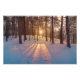 Pôr do sol na floresta invernal de neve. Um pôr do sol colorido em florestas coníferas com pinheiros. Paisagem de inverno.