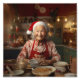 Retrato de uma sorridente Sra. Papai Noel assando um bolo em sua cozinha no Polo Norte. Na cozinha confortável, quente e brilhante, Sra. Papai Noel, uma vista alegre, com avental amarrado e farinha no ar, ela assar um bolo com amor e cuidado.