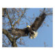 Uma águia careca capturada na sua aproximação de aterrissagem. Uma águia majestosa, careca, com uma envergadura de asa entre 6 e 7 pés. À medida que desce para pousar, suas asas são esticadas, mostrando a impressionante extensão de penas. As penas brancas da cabeça e cauda destacam-se contra o corpo castanho-escuro, criando um contraste impressionante.