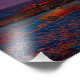 Um design de arte de um belo pôr do sol também mostrando rochas, praia e um homem pescando.