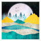 A beautiful landscape with unique textures showing a huge supermoon rising in a mountain landscape with rolling hills and trees in shades of blue, cyan, gold, and yellow.