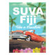 Suva, poster de férias de vintage em Fiji. Poster de viagens de automóveis clássico Suva. Carro clássico.