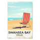 Poster de Swansea Bay Wales, à beira-mar, num estilo vintage, de uma cadeira de chão listrada vintage na praia arenosa durante um feriado de verão.