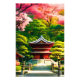 Um templo japonês pacífico cercado por flores de cereja e arte de árvores verdes.