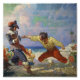Newell Convers Wyeth foi um artista e ilustrador americano. Ele era o aluno do artista Howard Pyle e tornou-se um dos maiores ilustradores da América. Esta pintura é chamada "O Duelo na Praia" e retrata 2 piratas lutando com espada e rapier enquanto uma plateia de buccaneiros cinzentos olha em frente.