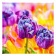 Violeta colorida, tulipas roxas, cor-de-rosa num leito de flores. Praticamente todas as cores do arco-íris estão presentes. Bela e positiva cena floral. Fotografia macro.