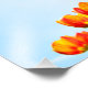 Foto impressão de flores compostas de tulipas laranja e vermelha vistas de um ponto de vista baixo contra um céu azul.