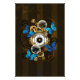 Composição do relógio de aço redondo com discagem numérica romana preta, decorado com engrenagens de ouro e latão, borboletas morfo azuis e lentes danificadas sobre fundo listrado castanho. Estilo Steampunk.