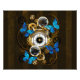Composição do relógio de aço redondo com discagem numérica romana preta, decorado com engrenagens de ouro e latão, borboletas morfo azuis e lentes danificadas sobre fundo listrado castanho. Estilo Steampunk.