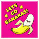 Adesivo adorável, apresentando um desenho animado fofo, banana amarela kawaii feliz com os sorrisos mais doces, olhos grandes redondos e casca meio descascada. Acima dele, em letras amarelas com uma sombra preta, está escrito 'Vamos Ficar Loucos!'. Duas estrelas amarelas brilhantes estão em ambos os lados das palavras.