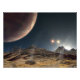 Vista de uma lua hipotética em órbita em torno do primeiro planeta conhecido a residir num sistema de três estrelas de malha apertada