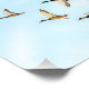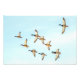 Dez patos-reais voam em formação através de um céu azul brilhante.