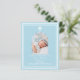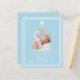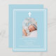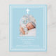 Um fundo azul claro, decorado com um quadro branco, e uma cruz branca Personalize e adicione um nome de foto e detalhes. Texto branco. Quadro fotográfico em forma de arco. 1 folha = 1 convite impresso de borda a borda.