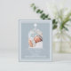 Fundo azul empoeirado, decorado com um quadro branco, e uma cruz branca Personalize e adicione um nome de foto e detalhes. Texto branco. Quadro fotográfico em forma de arco. 1 folha = 1 convite impresso de borda a borda.