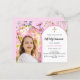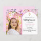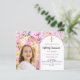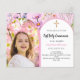 Adicione sua própria foto de tamanho vertical. Um quadro fotográfico em forma de arco rosa. Uma cor branca de fundo. Decorado com flores cor-de-rosa e uma cruz ouro. Personalize e adicione um nome e detalhes. 1 folha = 1 convite impresso de borda a borda.