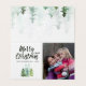 Cartão de foto de Natal com floresta em aquarela no inverno com coníferas e tipografia de letra manuscrita trendy.