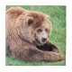 Urso grande, fofinho e com conteúdo marrom deitado na grama olhando para a câmera.