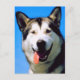 Este cartão postal tem uma foto colorida adorável de um cachorro husky ofegante com a língua para fora.