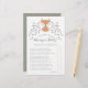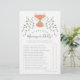 Um jogo bonito de adivinhação para o seu chá de fraldas com um filhote de raposa desenhado à mão rodeado de verde. Abaixo, há 15 perguntas da sua escolha. Este cartão de atividade foi feito para corresponder aos nossos convites de "Chá de fraldas Rústico Rústico Rústico da Fox Cub". Exibir a coleção vinculada nesta página para coordenar produtos.
