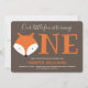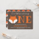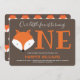 Um primeiro convite de aniversário para bebês que diz "Nossa raposa está virando uma". Este convite é marrom e laranja com a palavra "Um" em letras grandes, com uma ilustração do rosto da raposa como primeira letra da palavra. Simplesmente, personalize este convite, adicione-o ao seu carrinho e feliz aniversário ao seu maravilhoso bebê! Fox Transformando Um Primeiro Aniversário Animal Invocando Design de Feriado | ©Melissa Patton — Artista/Ilustrator