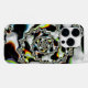 Esta capas de iphone apresenta uma arte fractal espiral abstrato e psicodélica a preto e branco com sotaques amarelos, cor de laranja, azuis e verdes.