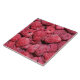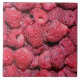 Uma pilha de framboesa vermelha. Vista aproximada. Framboesa simboliza amor, paciência, proteção e fertilidade. Presentes para todos. Produtos e lembranças de formato quadrado.
