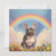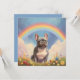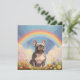 Um cartão de compaixão francês Bulldog personalizado, com uma bela pintura de um Bulldog Francês numa colina celestial, com um belo arco-íris. Simbolizando o cão Bulldog francês passou a ponte arco-íris para o céu de cão. Você pode personalizá-lo com o nome do seu cão Bulldog Francês ou qualquer outro texto no verso do cartão. Faz um memorial especial ou um presente de simpatia para qualquer amante de cachorro francês se seu querido cachorro passou.