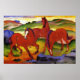 Franz Marc Grazing Horses poster. Petróleo na canvas desde 1911. Franz Marc foi pintor excelente de cavalos ao longo de sua carreira. Cavalos Doentes é um dos seus trabalhos mais bonitos. Ao contrário de suas outras pinturas de abstrato, o Cavalo Grazing apresenta três cavalos marrons naturais entre as colinas, enquanto o sol se põe transforma a paisagem numa variedade de lindas cores. Um presente bonito para fãs de Franz Marc, pinturas de cavalos, expressionismo e arte animal.