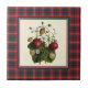 O azulejo cerâmico trivet com uma ilustração botânica de morangos, limpa digitalmente, sobre um fundo de textura leve de pergaminho. Enquadrado com a Fraser da família Lovat, o padrão moderno de clã tartan. Xadrez tradicional escocesa desde 1893, em vermelho vivo, azul marinho, verde florestal e branco.