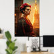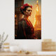 Um tributo ao espírito de Frida Kahlo, queimando brilhante, inviolável. Com a coroa floral e os céus iluminados pelo fogo, este retrato surreal funde a tradição e a rebelião. As texturas venenosas conhecem a mística moderna. Mantenha-o alto, segure-o orgulhoso. Eu sou minha própria musa. Eu sou a chama
