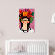 Belamente desenhada Frida Kahlo poster com elementos florais em fundo rosa